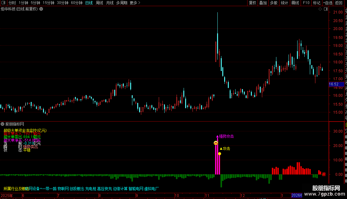 指标主要用于实时监控市场中超级大单资金的流向与活跃程度,通过识别大额成交是否伴随价格上涨,判断主力资金是积极进场还是出逃。它不仅统计累计净流入/流出金额,还结合近期量能基准,评估当前资金动作是否异常,并据此划分攻击强度和资金状态。图表上用不同颜色柱体直观显示买卖力度,同时标注“强势攻击”“连续流入”等关键信号,辅助判断短期多空动能。