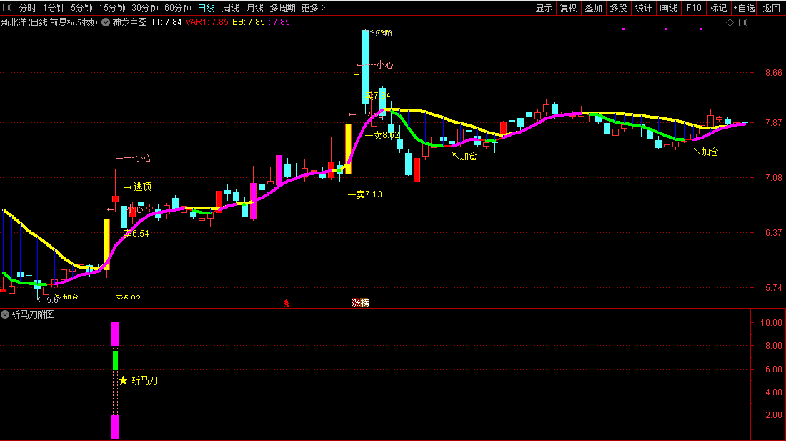 4、选股公式出信号后,结合八戒神龙主图的加仓信号,同时出现,大概率个股进入主升浪,加仓信号可以提前或延后1至2天。