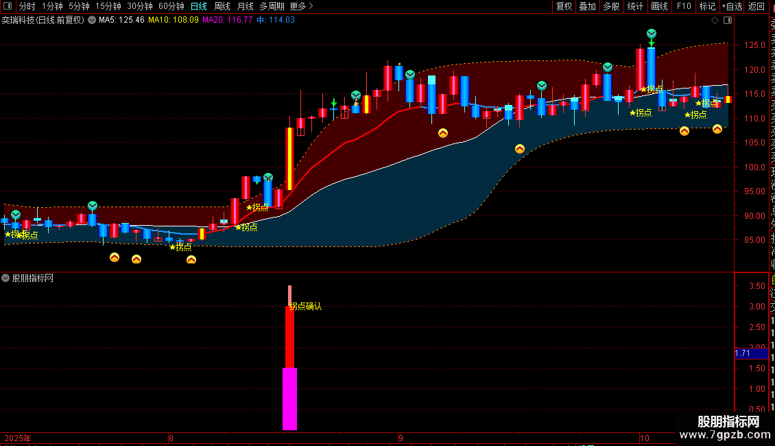 指标旨在捕捉个股首次强势涨停后的“拐点”机会。它通过识别当日大幅放量、股价快速拉升、收盘价明显高于开盘价,并且短期趋势已转强的股票,来判断是否出现主力资金启动的信号。同时结合前一日成交金额与当前的对比,排除连续爆量的情况,聚焦于首板或初期启动阶段的标的。当所有条件吻合时,系统会以彩色柱状线和文字提示“拐点确认”,作为潜在买入信号。