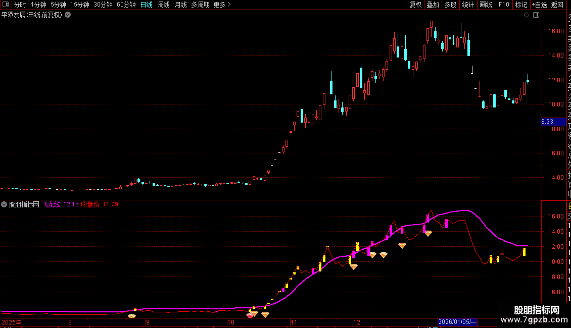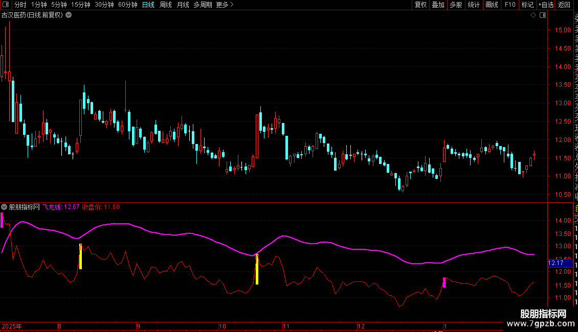 指标通过多条均线组合判断股价强势突破信号。首先构建一条基于短期指数均线的“飞龙线”,当股价上穿该线时提示潜在买点;其次,系统同时监测多个不同周期的均线,若当日开盘价低于多数均线而收盘价站上,则视为多头共振;再结合放量大涨、光头阳线等特征,筛选出高动能上涨K线,并用图标和彩色柱体突出显示。整体策略聚焦于捕捉短期强势启动或加速上涨的个股。