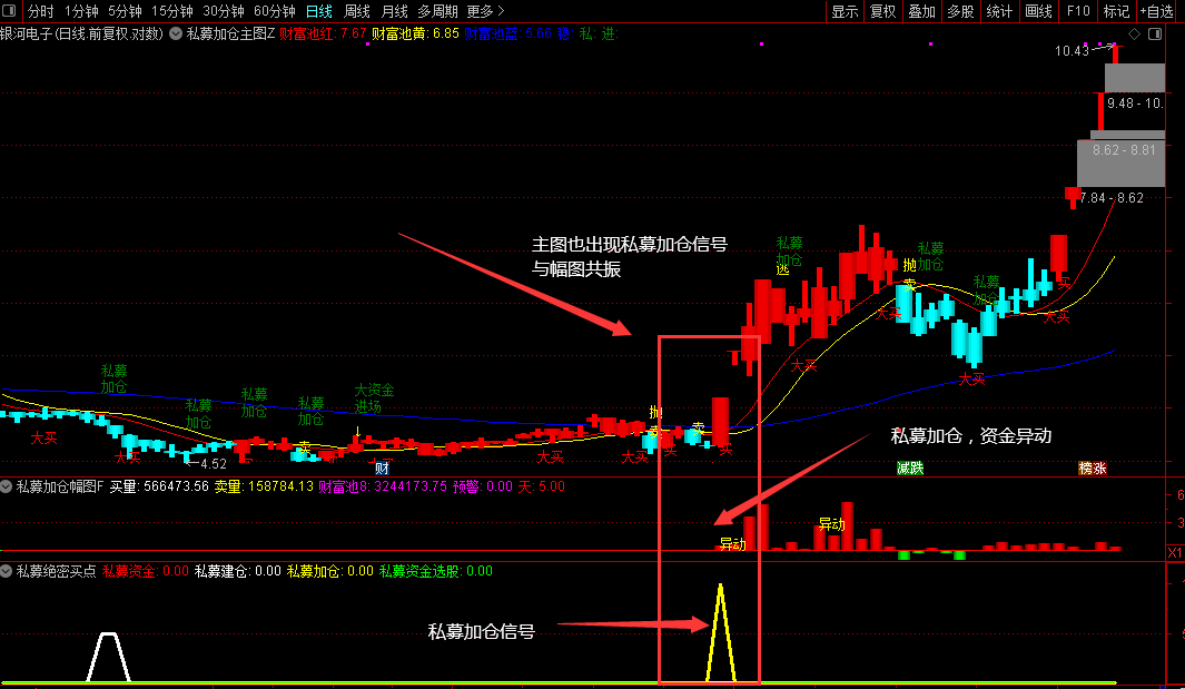 用法:黄色“私募加仓”信号出现,通常意味着股价可能开始一波强势上涨,是追涨或加仓的信号。但需注意追高风险。