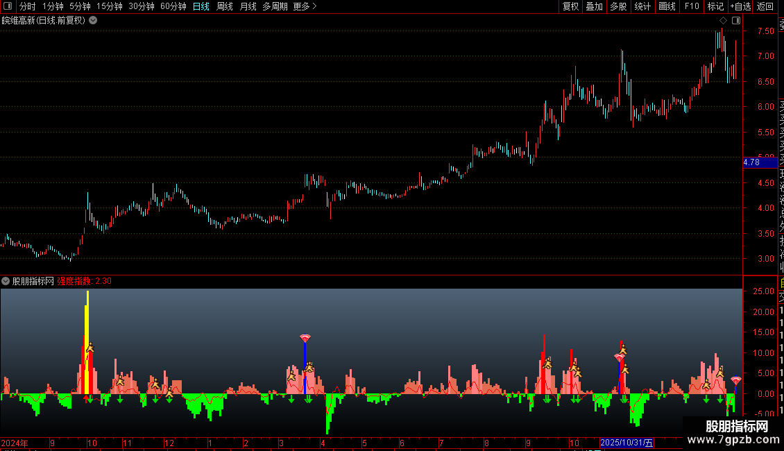 指标主要通过价格与成交量的综合关系,识别市场短期动能的突变和潜在启动信号。它结合了多周期动量、偏离度及强度变化,重点捕捉股价在放量背景下的加速上涨机会,并对异常波动进行可视化分级。当价格涨幅、量能放大与动能指标同步增强时,系统会发出提示信号;同时,也监控强度指数的快速回落,辅助判断短期过热或动能衰减风险。