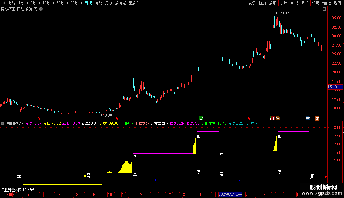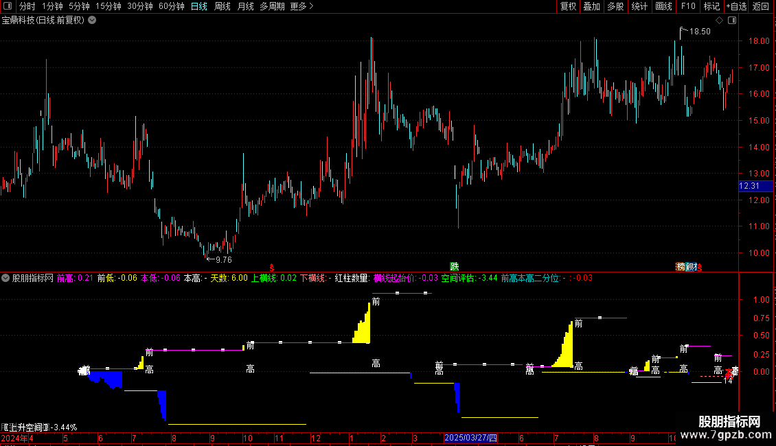 前高本高二分位:IF(MACD>0 AND 本高!=前高,DRAWLINE(WQG,(前高+本高)/2,REF(WQG,1),REF((前高+本高)/2,1),1)