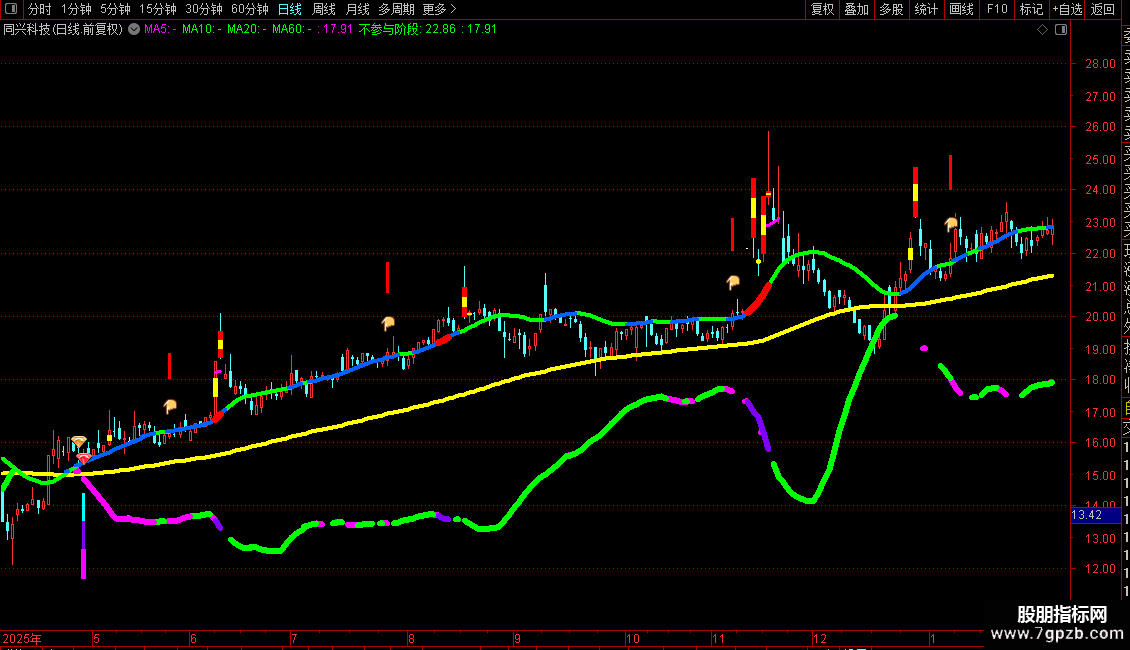 分道关注:IF(ZBGS350>=ZBGS358 AND 牛熊分道<=ZBGS358 AND ZBGS358<=REF(ZBGS358,1),ZBGS358,DRAWNULL),COLORMAGENTA,LINETHICK6;