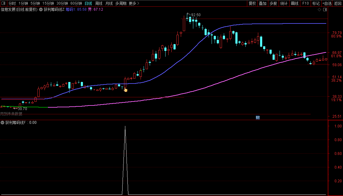 本指标是获利筹码线,是筹码类型公式,用到winner和cost筹码函数。