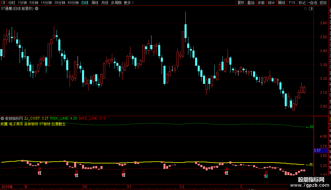 K线颜色:浅红色K线表示收盘价低于市场成本(C < ZJ_COST),属于“潜伏区”;正常颜色表示高于成本,属于“获利区”。