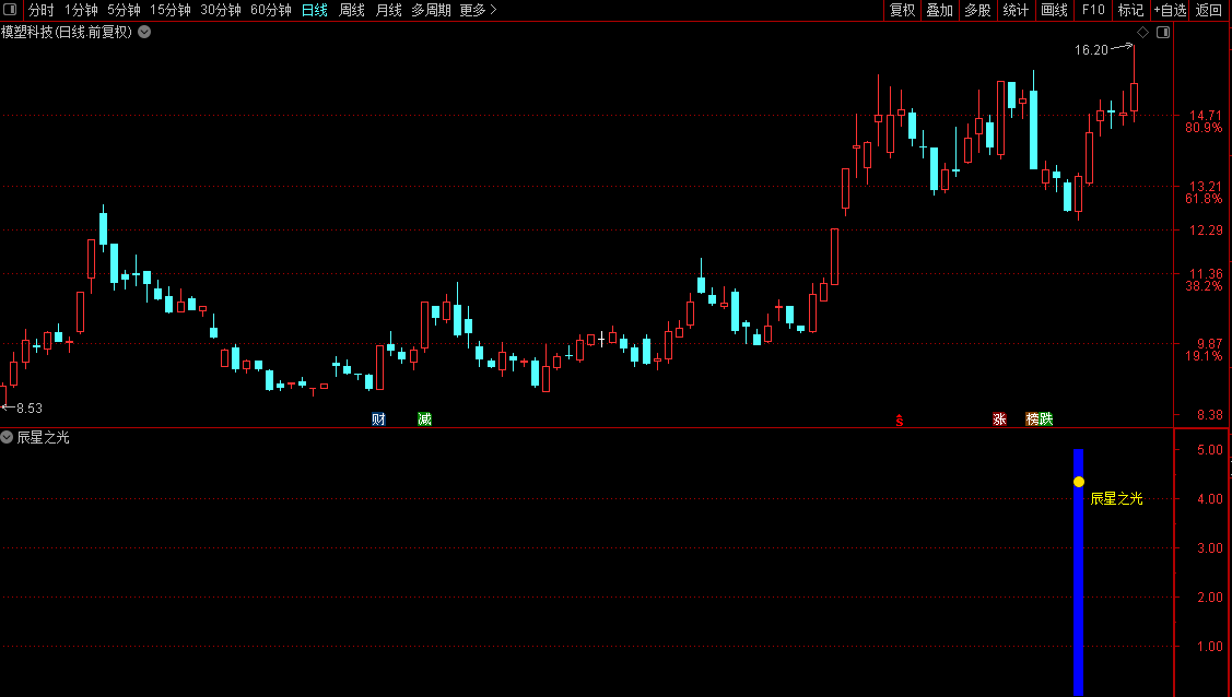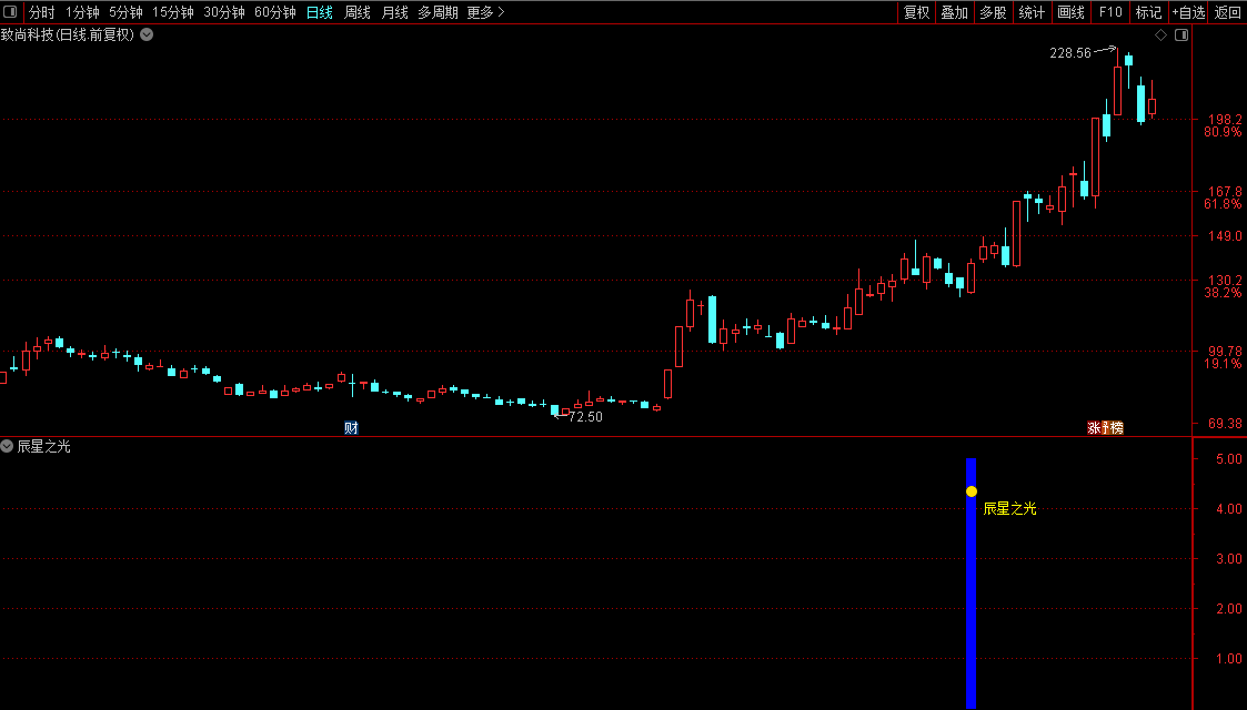 当以上所有条件同时满足时,副图上就会在对应K线位置出现蓝色的柱状标记和“辰星之光”的文字提示,非常醒目。