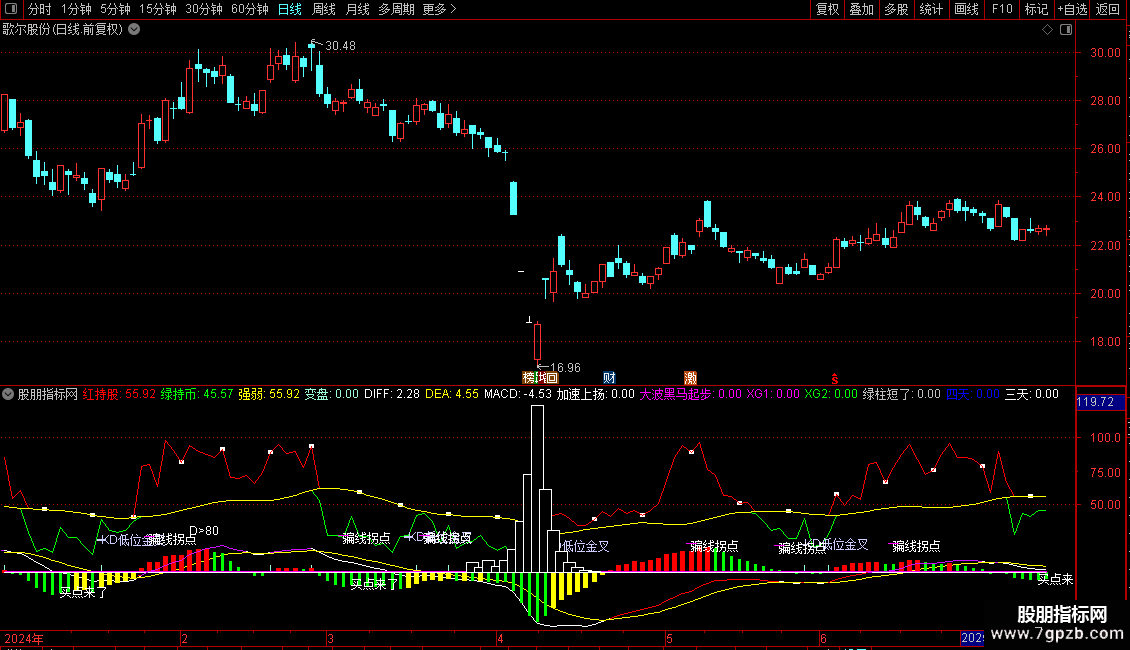 DRAWTEXT(FILTER(CROSS(K,D) AND D<26,6),H*0.95,'KD低位金叉'),COLORFFCCCC;