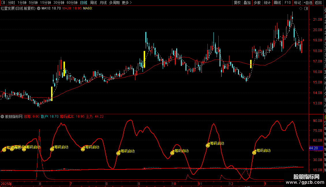 副图融合RSI、KDJ优化算法与筹码吸筹能量柱,红色柱体越长代表主力吸筹越积极,并在主力线金叉散户线时发出“★筹码启动”信号。