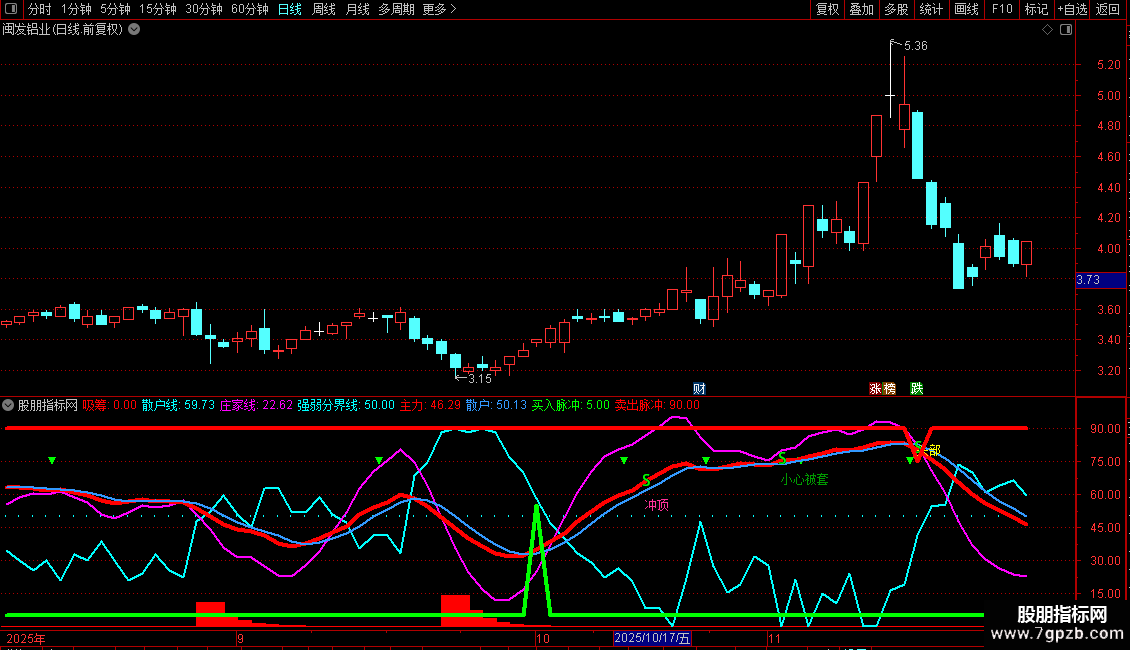 DRAWTEXT(CROSS(主力,75) AND 散户<主力,67,'小心被套'),LINETHICK2,COLOR009900;