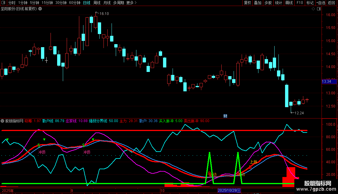 卖出脉冲:IF(CROSS(散户,主力) AND 散户>75,75,90),LINETHICK4,COLORRED;