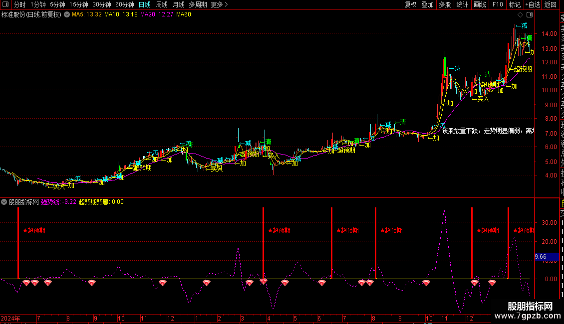 1. 主图公式:加载后显示5日、10日、30日均线,并自动标注“加”“减”“买入”“清”等文字提示。当出现“超预期”信号时,表明股票可能进入加速阶段,可重点关注。