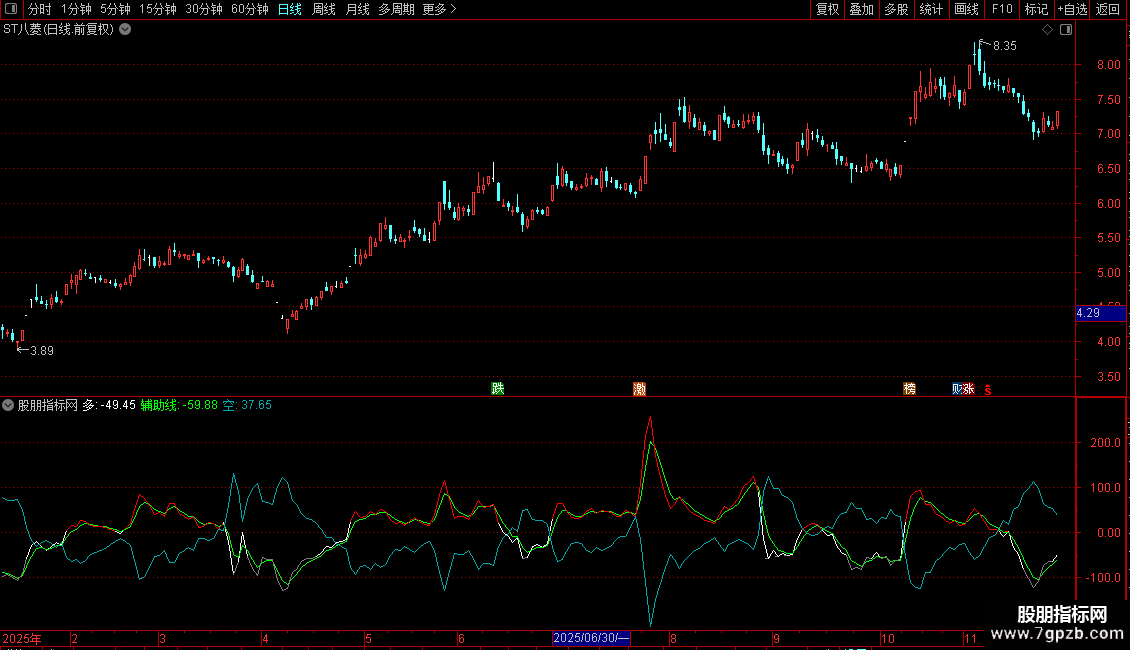 当“多”指标值小于-50时,该部分K线以灰色显示,表示极度弱势区域。