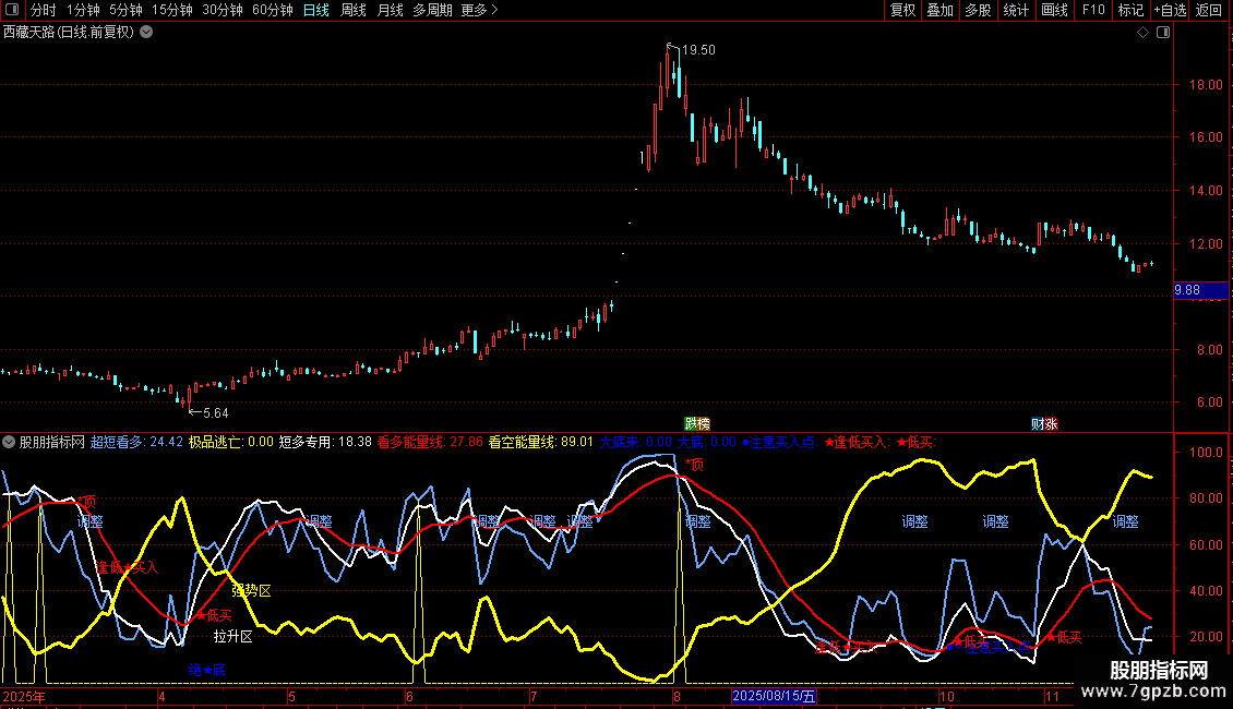 3. 调整: 当“看多能量线”下穿“短多专用”线时,在副图标记“调整”,提示市场可能进入短期回调或整理。