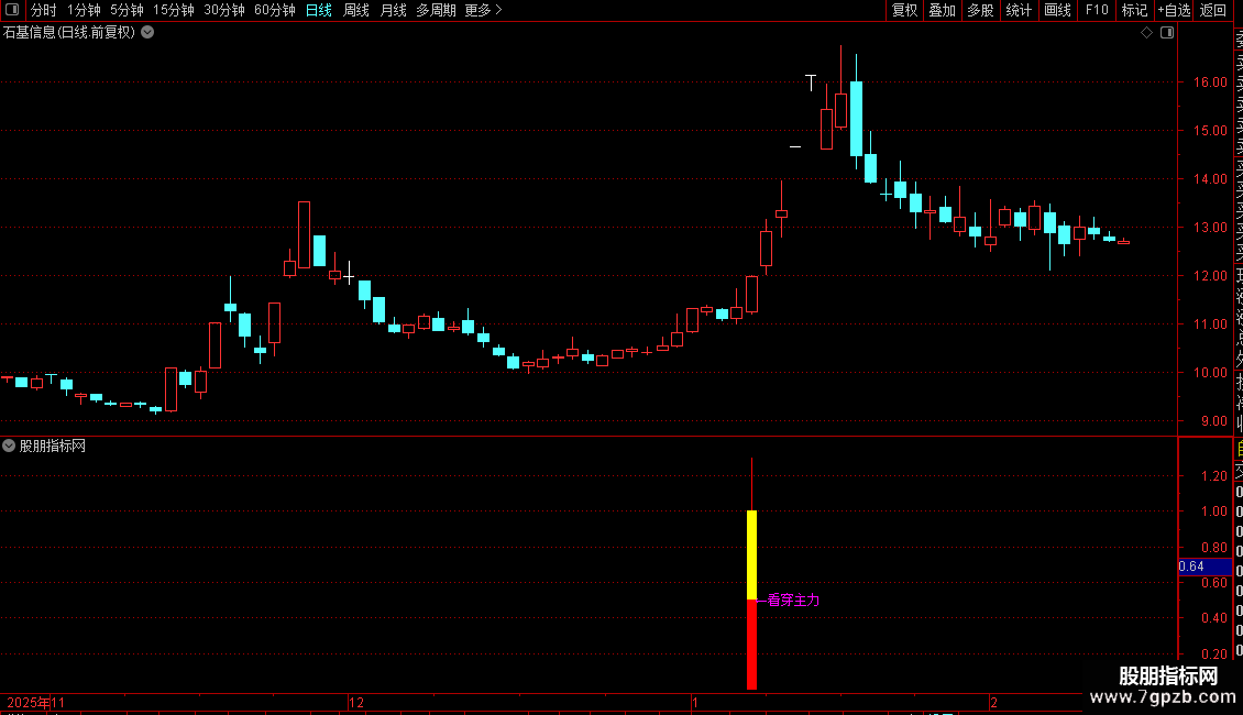 指标通过分析筹码分布与价格关系,识别主力资金可能介入的时机。核心逻辑是对比当前获利盘与近期价格波动区间的筹码集中度,当股价处于短期均线上方、主力筹码优势显现且排除涨停干扰时,发出“看穿主力”信号。适用于捕捉主力吸筹初期的低风险买点。