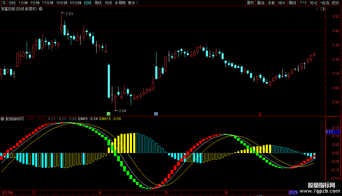 MACD柱状图用四种颜色区分状态:零轴上方上涨为黄色,零轴上方下跌为青色;零轴下方下跌为青色,零轴下方上涨为黄色。
