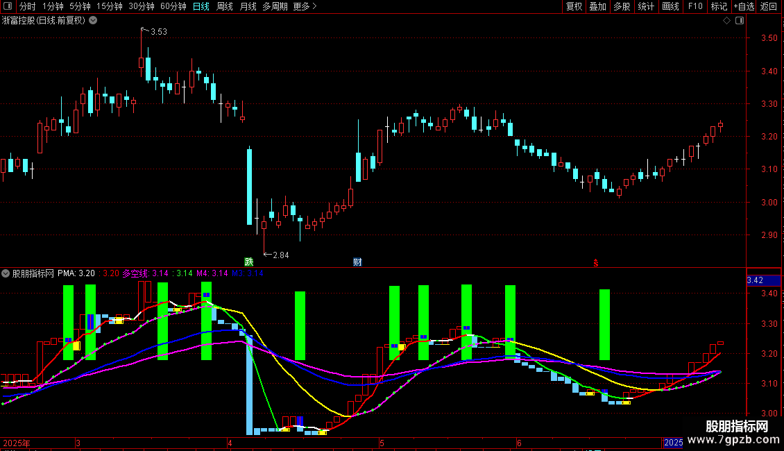 多空线:(20*X+19*REF(X,1)+18*REF(X,2)+17*REF(X,3)+16*REF(X,4)+15*REF(X,5)+14*REF(X,6)