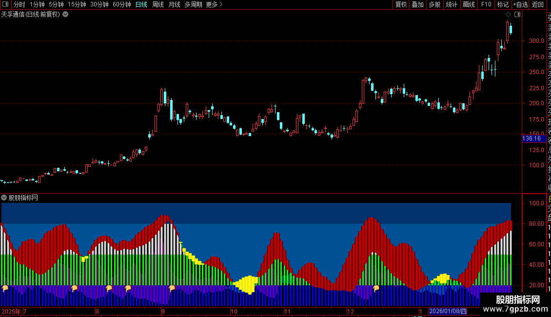 2. 多指标共振验证:KDJ指标的D线与ADXR线的柱体对比为关键共振信号——红色系柱体(D>ADXR)代表多头动能占优,蓝白色系柱体(D<ADXR)代表空头动能占优,柱体形态越明显,动能共振越强。