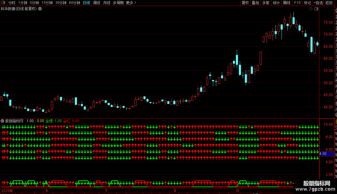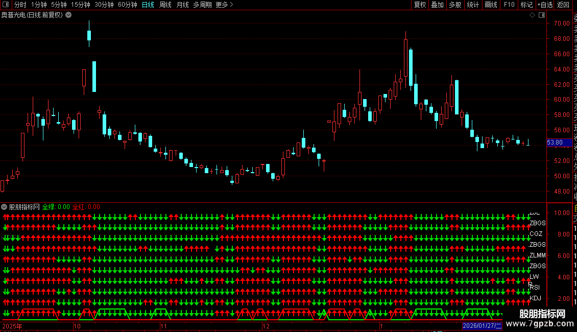 1、指标构成说明:该指标由十个独立的子指标共同组成,从上至下共显示十行,每一行对应一个经典技术分析指标。当某个子指标出现金叉信号时,对应行会显示红色向上箭头;若出现死叉,则显示绿色向下箭头,便于用户直观判断买卖时机。