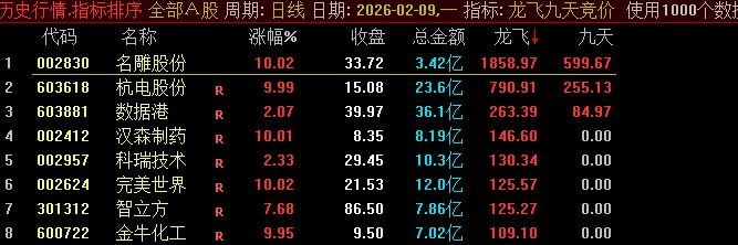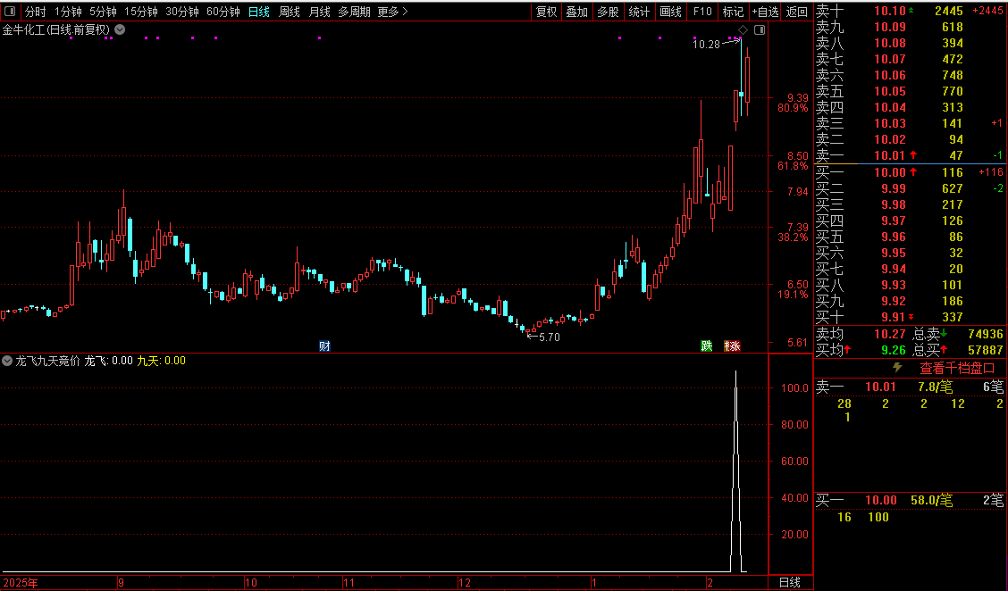 指标主要用于识别强势股在涨停后次日高开但未极端冲高的潜在机会。它综合考量个股的安全评分、近期是否连续涨停、开盘涨幅、前一日是否为一字涨停等因素,并结合资金面和流通股本数据,计算出一个“龙飞”动能值。当该值达到一定强度,且满足特定价格与成交量结构时,视为短线进攻信号。
