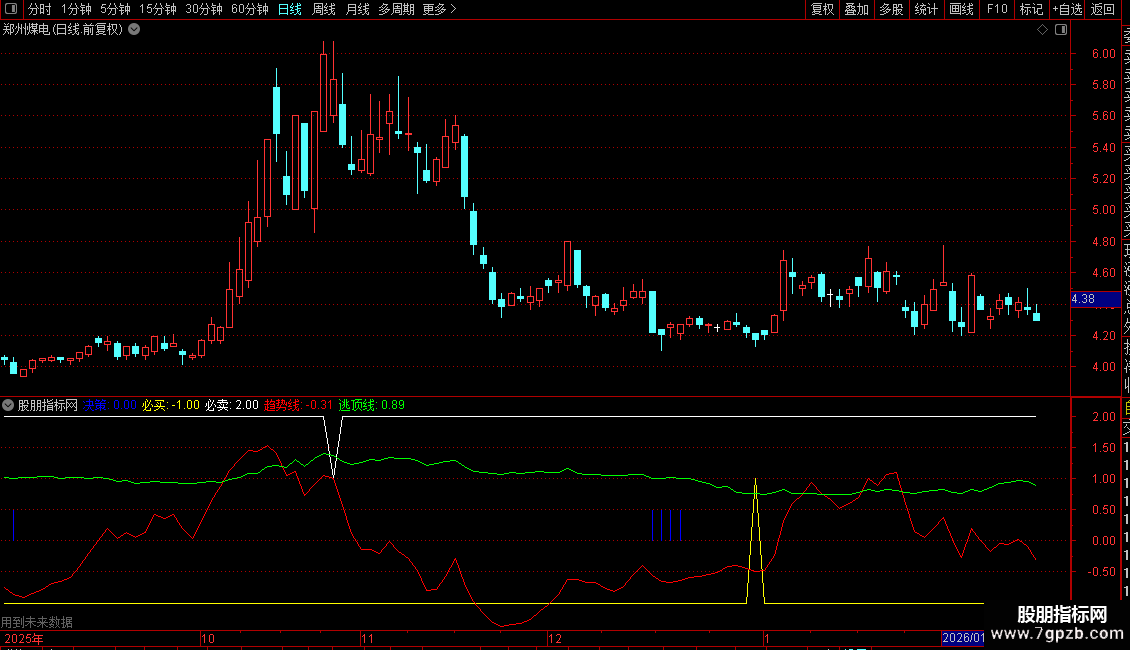 必买:使用TROUGHBARS函数寻找最近一个满足条件的波谷位置。若当前是波谷(结果为0)且最高价大于最低价加0.01,则输出1,否则输出-1。以黄色细线显示。