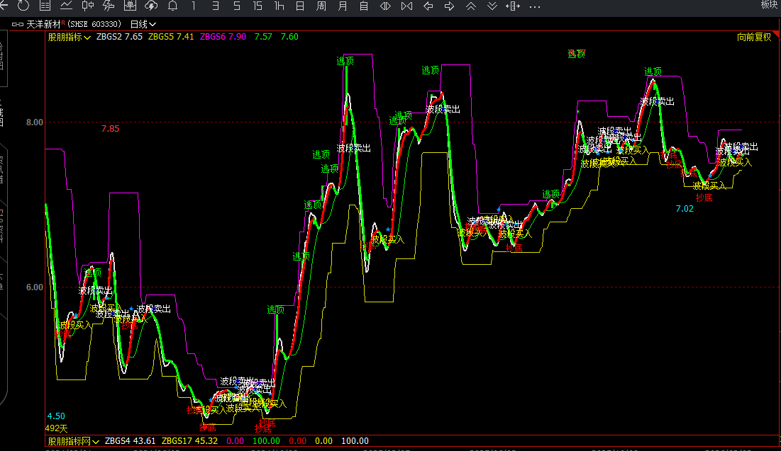 公式核心构建三重信号层:首先,以加权价格(结合开盘、最高、最低、收盘)计算5日基准线及±3%通道,并辅以21日高低点轨道,初步界定价格波动区间。其次,引入加权移动平均线(ZBGS8)与三重指数平滑线(ZBGS9-ZBGS11)的交叉机制,当快线上穿慢线时,在K线低位标记“波段买入”及星号提示;反之则在高位标记“波段卖出”,直观标示趋势转折点。最后,通过复合动量指标(ZBGS12)监控超买超卖状态:当指标上穿21.11时触发“抄底”信号,下穿78.89时则发出“逃顶”警示,有效规避极端风险。此外,公式还通过三重平滑均线(ZBGS14)与短期均线(ZBGS15)的对比,以红绿粗线动态显示短期趋势强度,强化视觉跟踪。