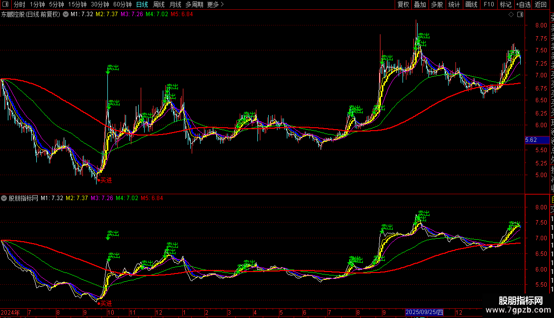 `M2`(8日EMA)与`M3`(13日EMA):短期趋势线。