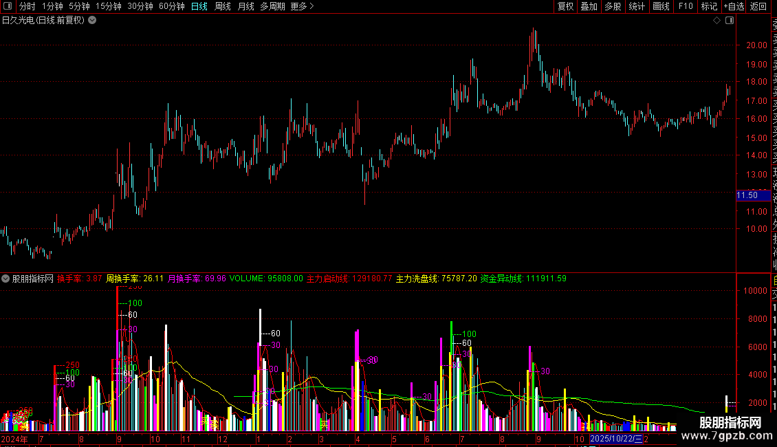 计算并显示当日换手率(不画线)、5日(周)换手率和20日(月)换手率。