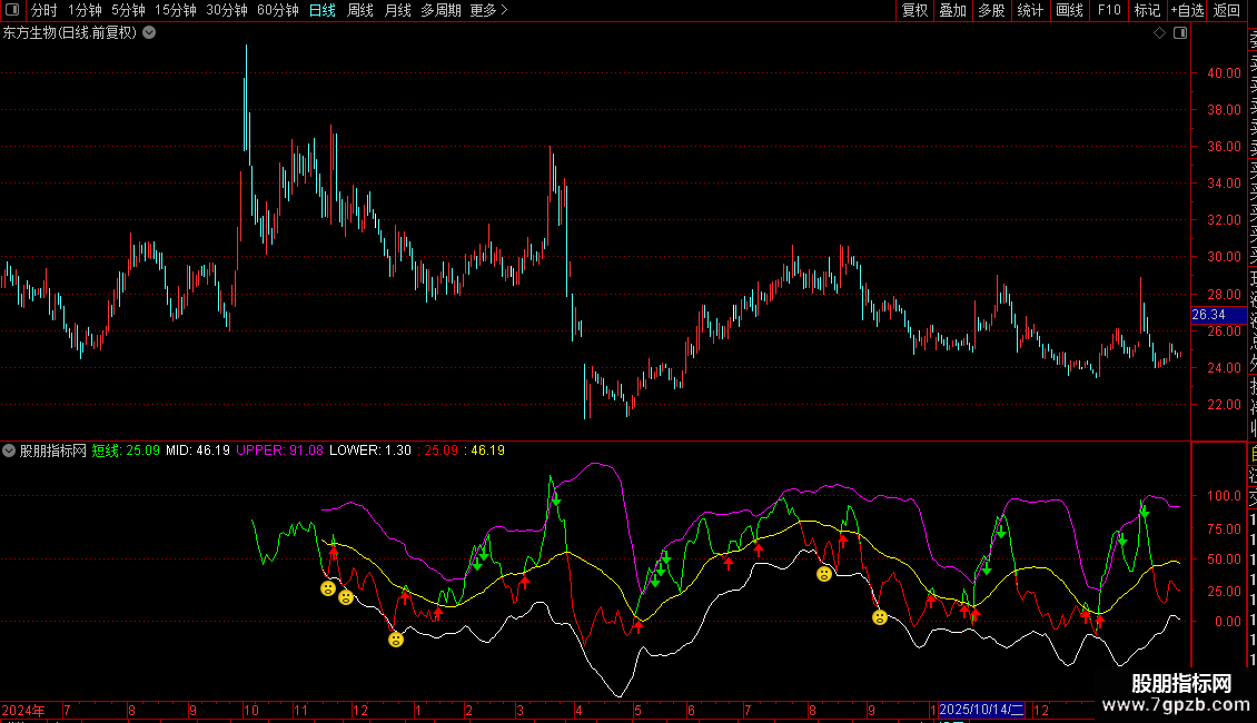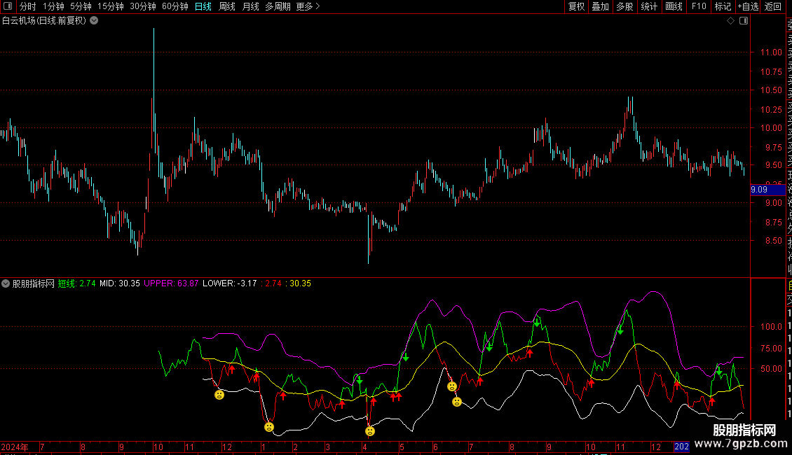 抄底信号:当“短线”指标自下而上穿越LOWER下轨线时,在下轨线下方约3%的位置(LOWER0.97)标记一个图标(通常为笑脸或钻石),提示超跌反弹机会。