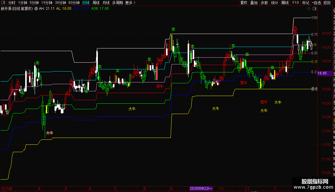 本指标公式利用了经典的黄金分割比例 例如0.236 0.382 0.5 0.618和0.764 结合股票价格的实际走势 精确标识出潜在的支撑位与阻力位 与传统固定数值分析不同 该公式能够根据市场波动自动调整 为投资者提供动态的股票技术分析参考
