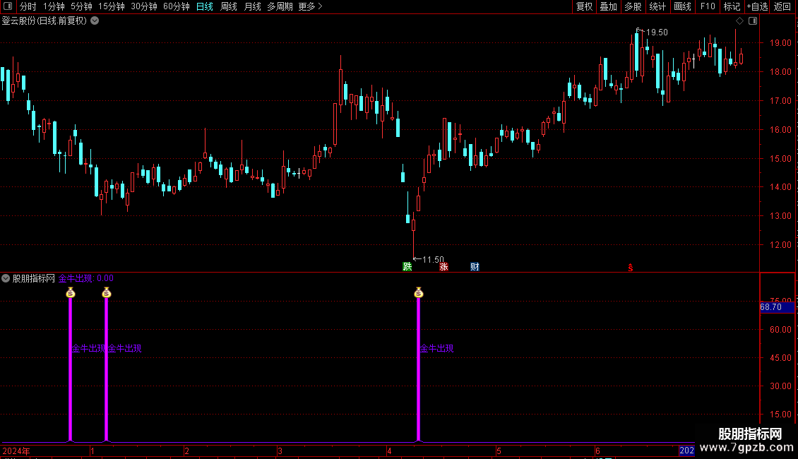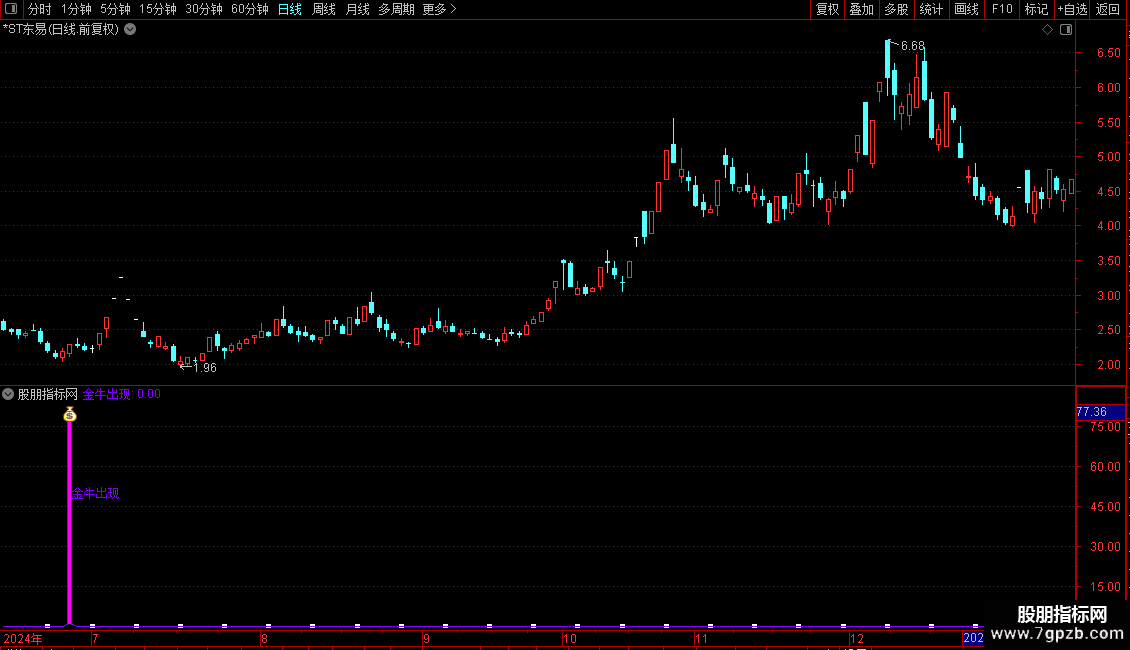 当“金牛出现”信号触发时,在副图或主图K线图上: