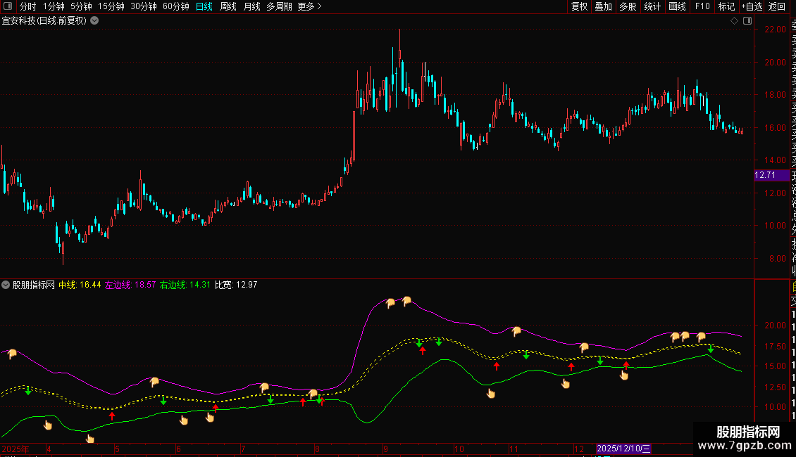 1. 指标性质:这是一个带有时间限制的通道类指标,包含中线、上轨(左边线)、下轨(右边线)以及买卖点信号。