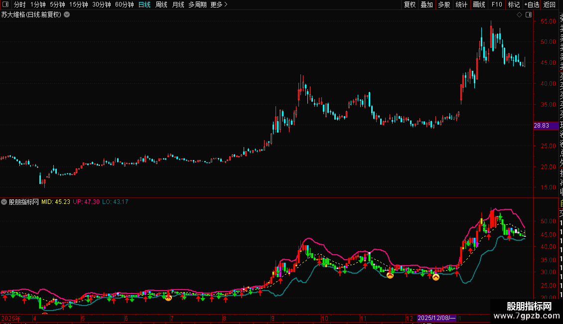 趋势与通道:首先观察股价相对于布林通道的位置和通道宽度,判断当前趋势强度和波动率。