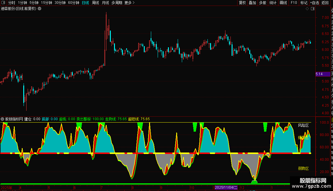 “强势区/弱势区”色带(NOTEXT1/NOTEXT2)与价格走势结合,可判断当前趋势是否有量价支持。