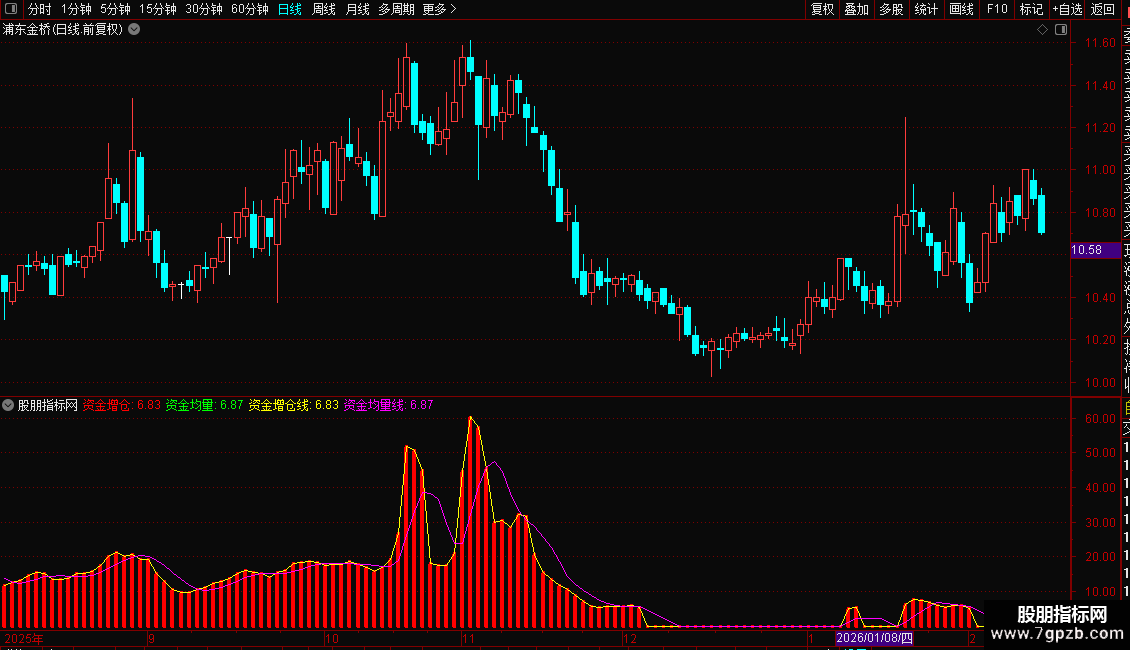 核心观察:关注红色粗柱线(资金增仓) 的出现及其高度,它表示经过公式模型判断后,符合条件的资金流入强度。