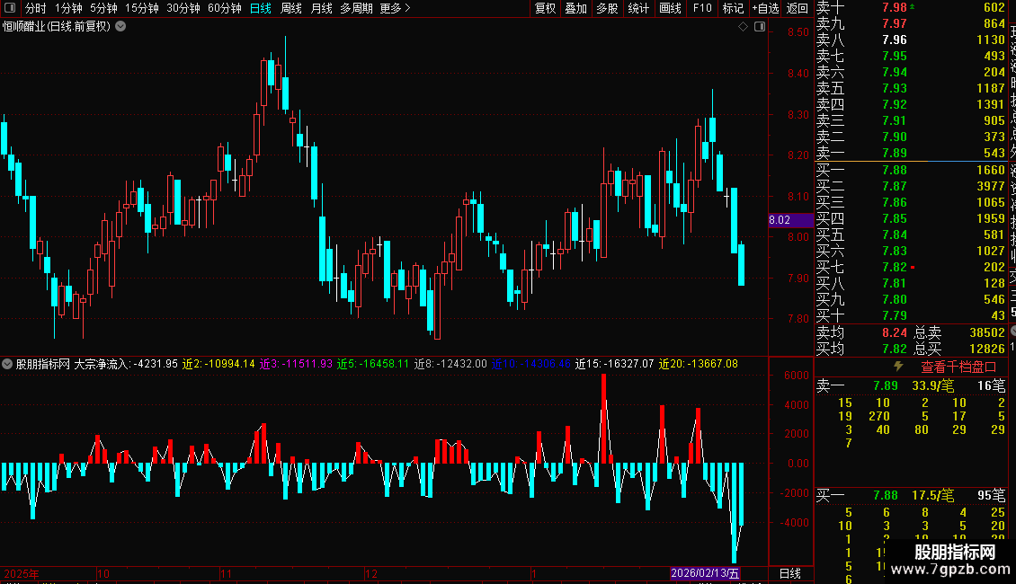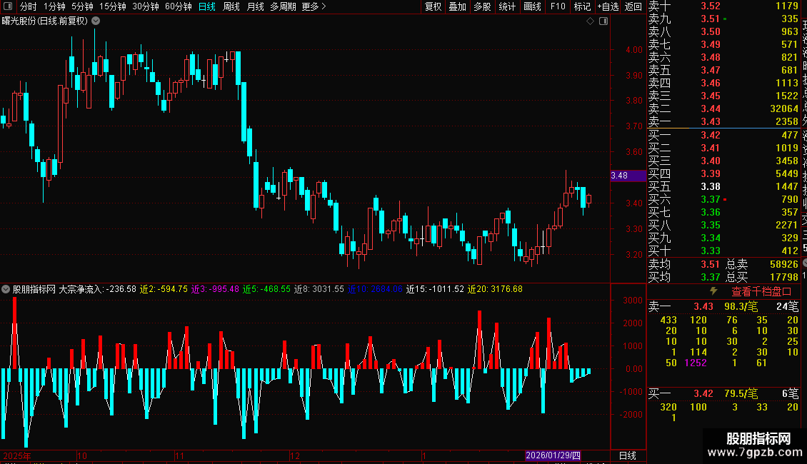 在主图区域,使用红蓝柱状图直观显示每日的“大宗净流入”数值。当值为正(净流入)时绘制红色柱,为负(净流出)时绘制青色柱。