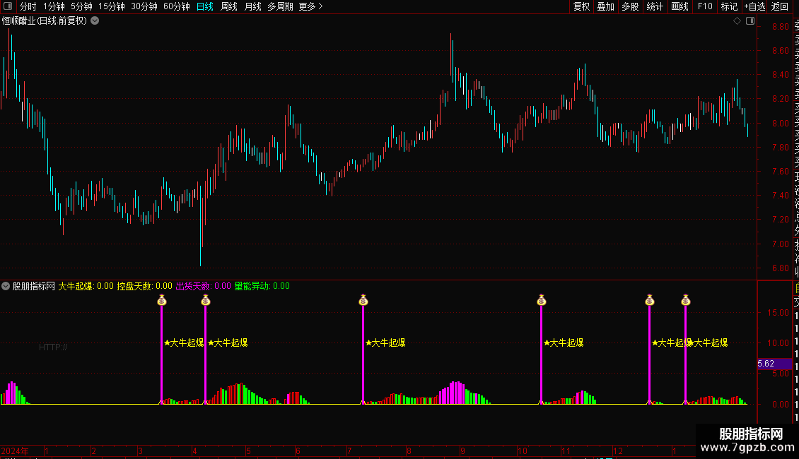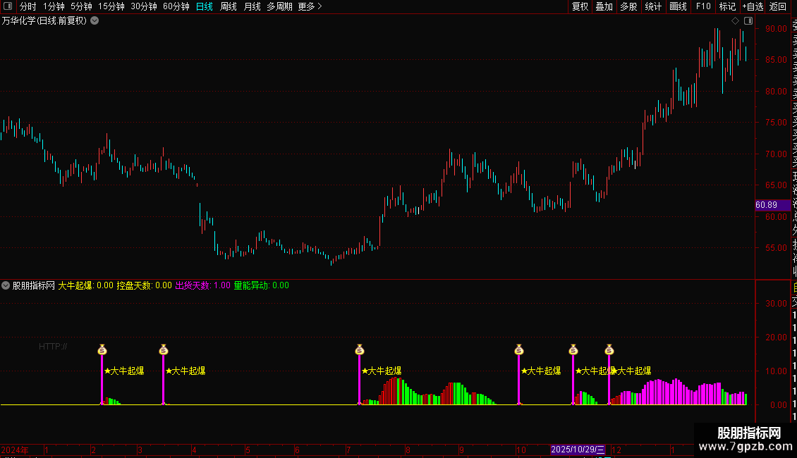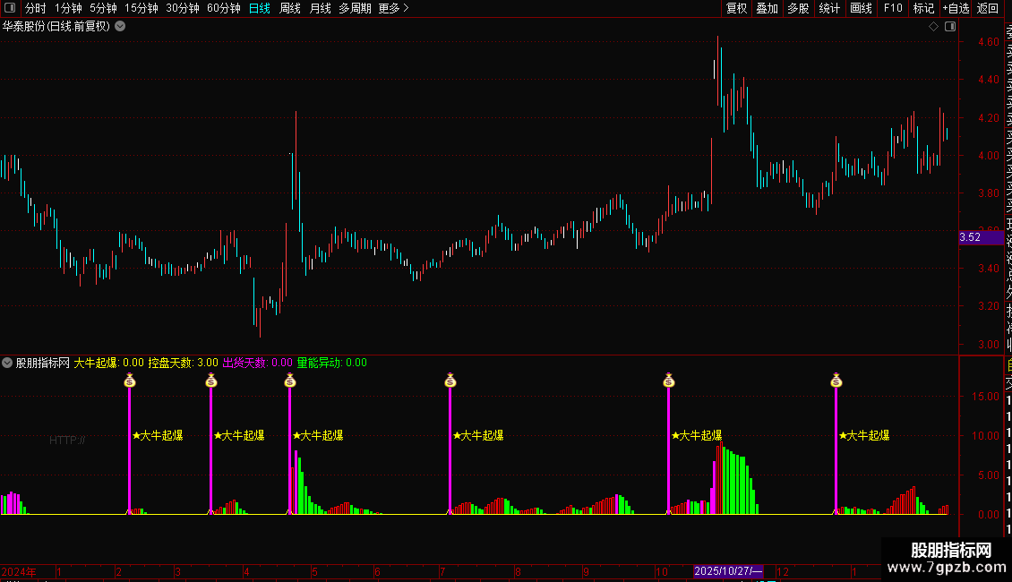 2. 起爆信号提示:当控盘指标上穿0轴(主力开始介入)且MACD处于做多区间时,会触发“★大牛起爆”黄色文字信号,同时伴随品红色柱体及对应图标,为进场提供明确指引;