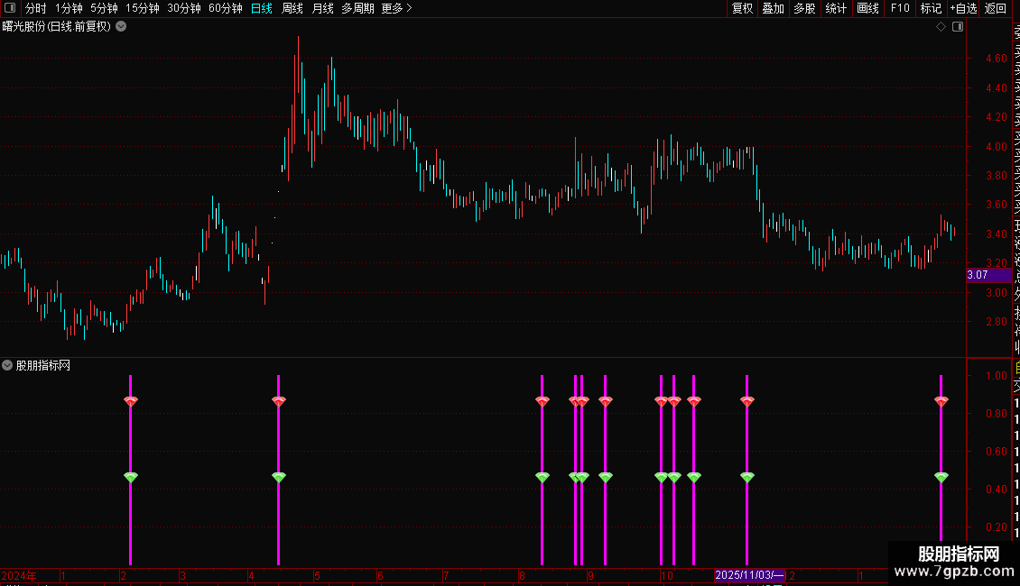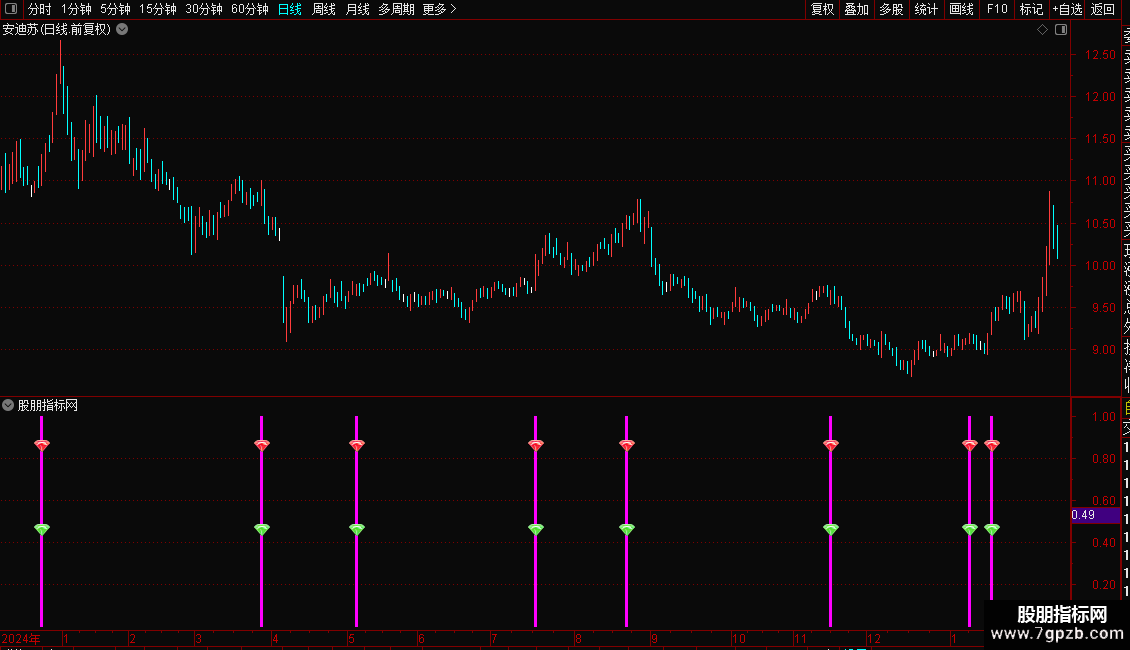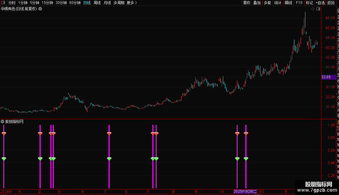 将公式加载到个股K线副图,当出现**紫色柱体+双钻石图标**时,为明确买入信号,信号同步匹配结果,可直观验证个股量价与指标共振有效性。