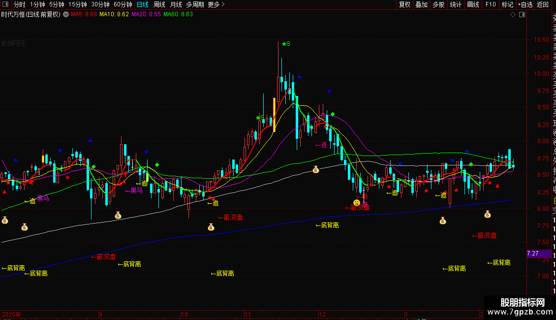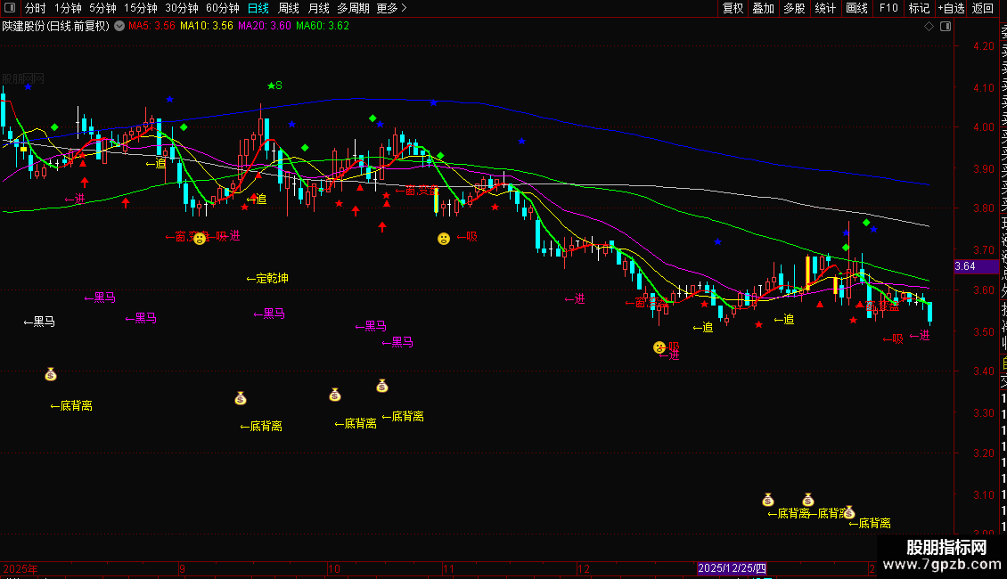 1. **买入信号**:当K线附近出现红色「吸」「买」、粉色「进」、黄色「追」「底背离」「定乾坤」或白色/紫色「黑马」提示时,结合5日均线向上(红色)的趋势,为低买时机;RSI跌破11后金叉、KDJ低位金叉叠加量能放大时,买入信号更可靠。