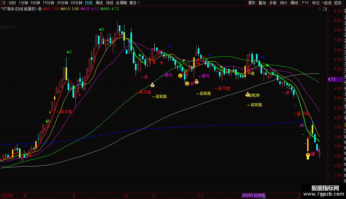 2. **卖出信号**:出现绿色「★S」、蓝色「★」、绿色「◆」提示,或RSI超买(JH9跌破84)时,结合5日均线向下(绿色),为高卖节点。