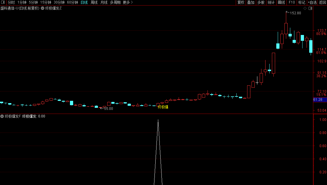 终极爆发:出信号可在尾盘相对低位及时介入,出现即是精品。止损位为当日K线最低点,不破当日K线最低点坚定持有,有5-10个点利润就走,勿贪。日积月累,利润也是可观的,祝大家股票天天长阳!