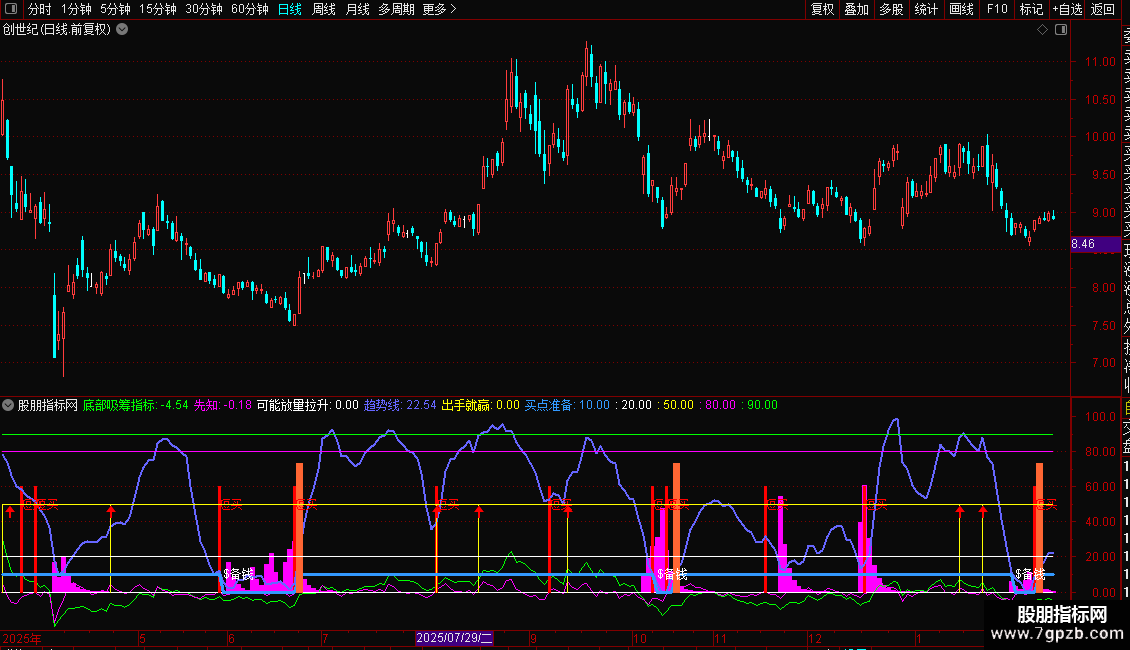 用法:这是一个强烈的“抄底”触发信号。当“底部吸筹指标”从下方上穿-24时,会触发一根贯穿画面的白色长柱,提示可能的中线买点。
