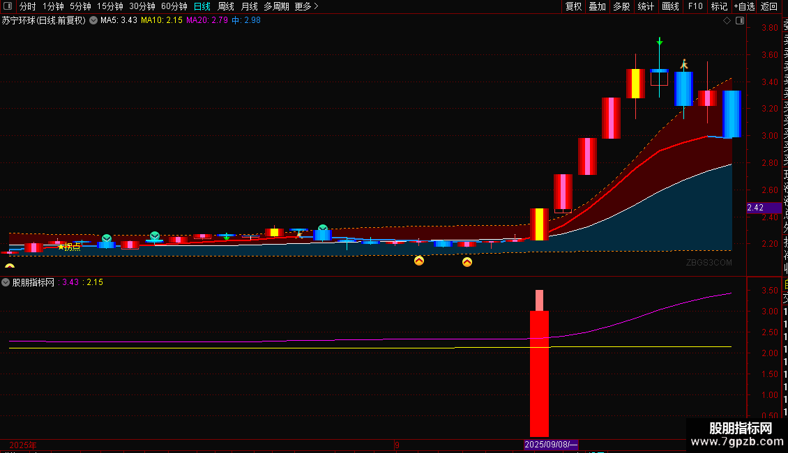 1. 主图:加载后观察黄色“★拐点”标注,结合通道支撑压力、买卖图标(底部34为买,顶部35/15/2为卖)判断趋势;红色K线为涨,蓝色系为跌,黄色柱是放量上涨。