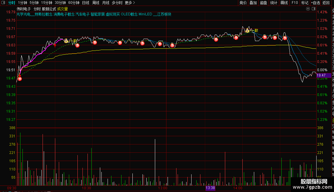 1. 信号识别:分时图中出现黄色“一致”图标,代表主力资金形成做多一致,是核心追涨信号;粉色“牛”字+图标,提示符合量价齐升、突破关键价位的捉牛机会;绿色“支撑”标注EMA26均线,黄色图标提示支撑有效,红色图标提示突破有效。