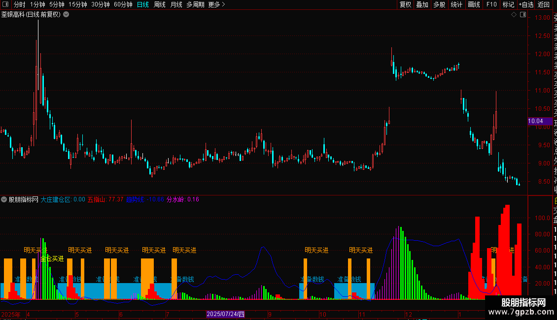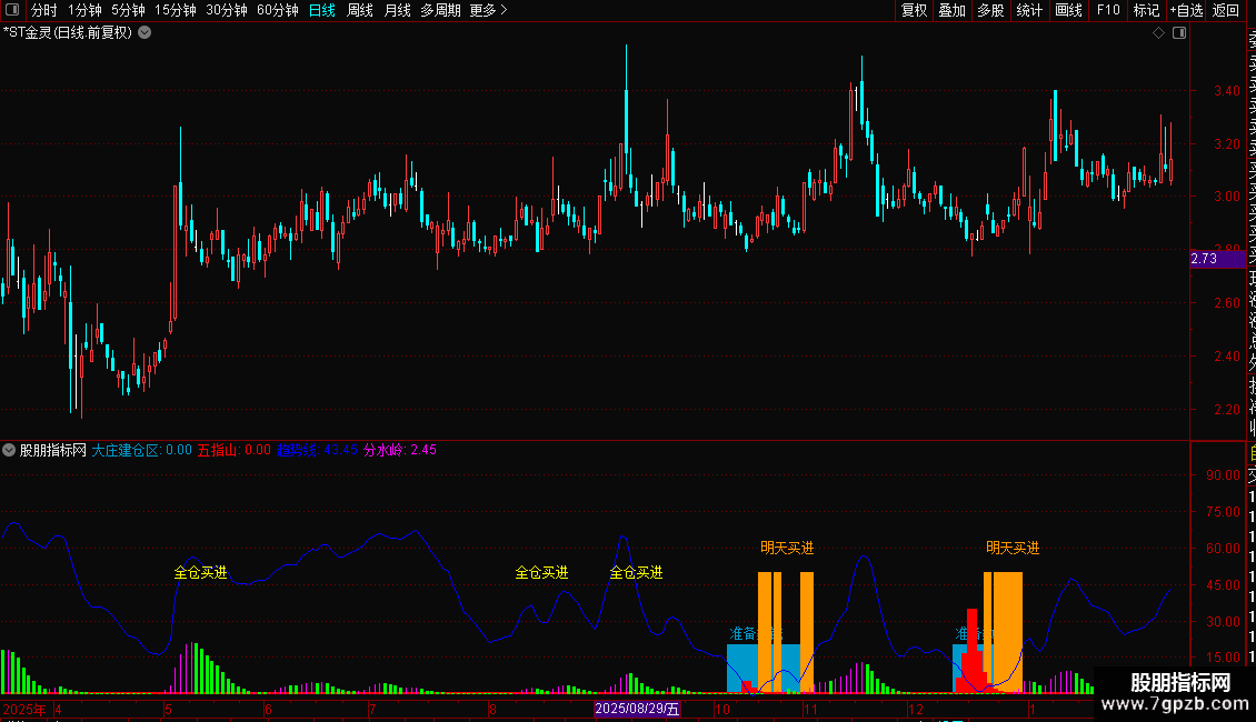“五指山”:在股价接近阶段低点且“趋势”值较低时,结合价格波动率,用于捕捉可能的主力建仓信号。当指标出现红色柱状线时,提示关注。