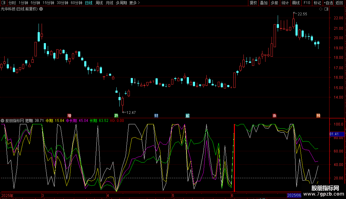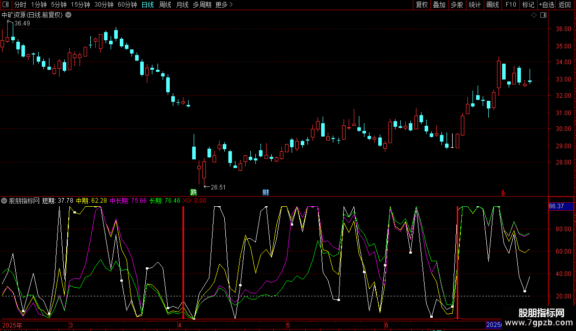 - 中长期:基于4N周期(默认20日)计算威廉超卖值,用洋红色线显示。