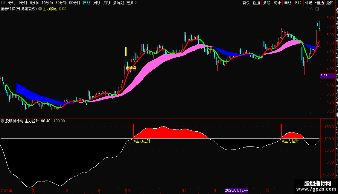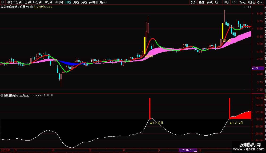 2. 副图使用:导入副图指标后,关注“主力拉升”线突破100的节点,突破时会标注“☆主力拉升”;
