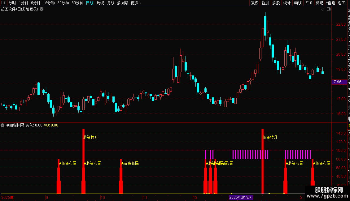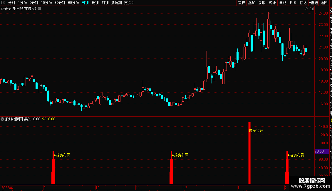 幅图指标核心通过价格涨幅筛选 + 量能结构背离 + 中期价格趋势三重逻辑,识别 A 股个股中 “游资拉升” 异动信号、“游资布局” 买入信号,同时统计 60 日内买入信号触发次数,在副图中直观标注各类信号,辅助捕捉游资介入的量价共振机会。
