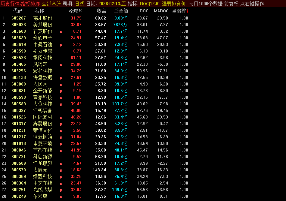 通达信【强弱排竞价】竞价排序指标适合捕捉强势股回调后的源码