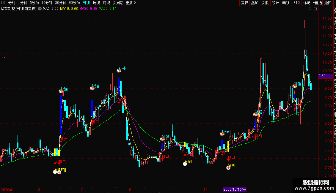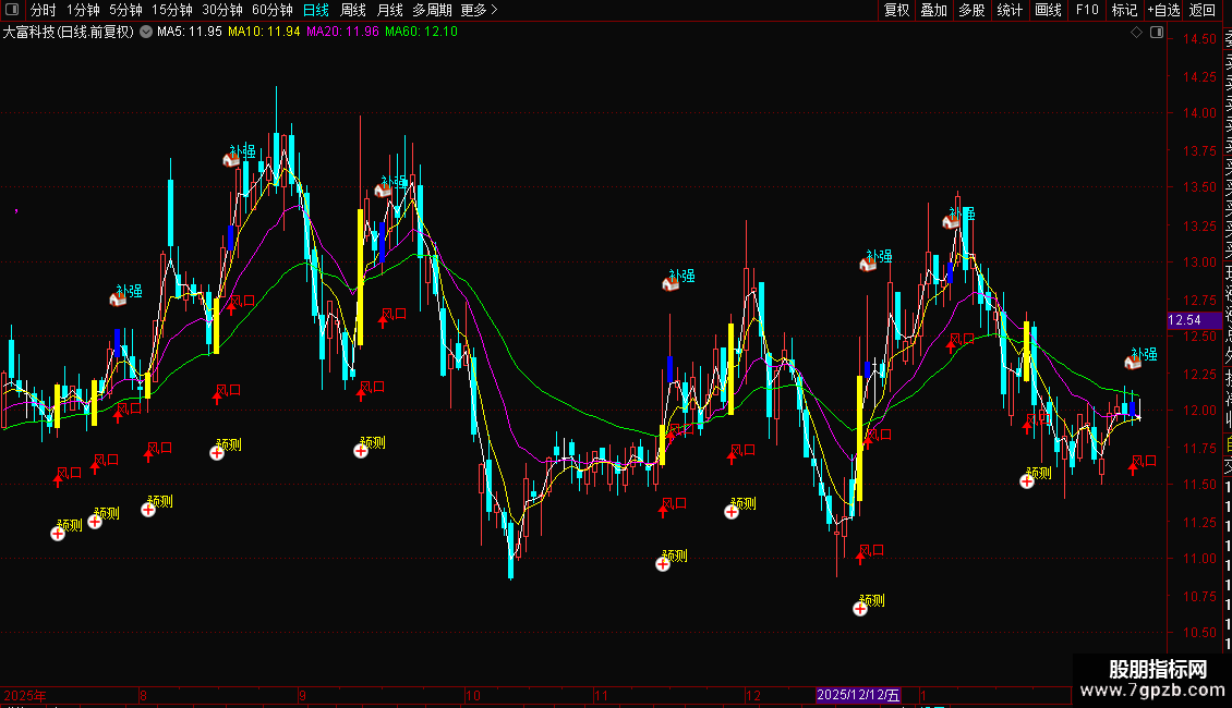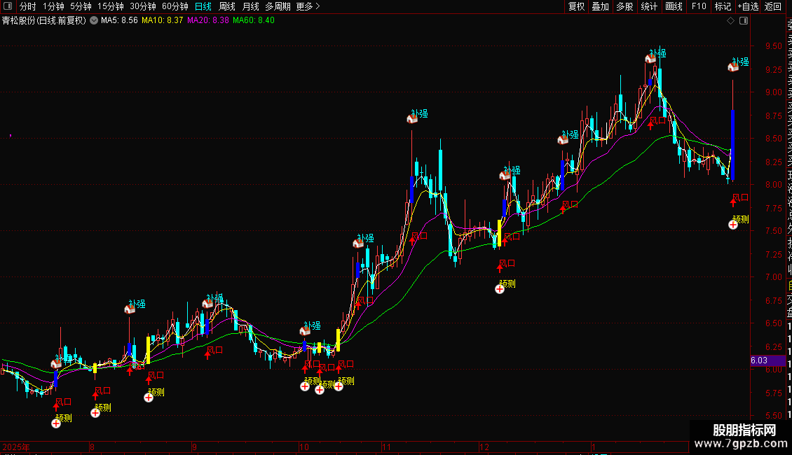第一,风口补强指标融合了两种核心信号机制。其一为预测型信号,通过识别股价短期快速突破多重均线压制,并同步伴随均线系统向上拐头的形态,提前预判趋势转强。其二为补强确认信号,该信号综合评估均线上升角度、价格动量变化以及中期趋势方向,当三者形成共振时,发出明确的趋势补强确认,提升信号可靠性。